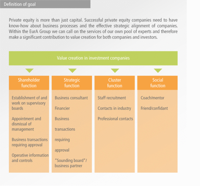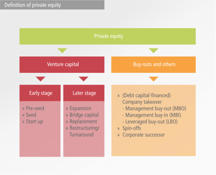Private equity is the term used for the equity capital of what are primarily institutional investors which is invested in companies not listed on the stock exchange. In Germany these non-listed companies are of considerable importance. In 2010 there were no less than 6,000 companies in which a private equity investor was involved as a shareholder and financial backer. There are many reasons why shares in companies are sold to private equity investors. One reason is to enable the shares of an entrepreneur to be taken over as part of arrangements for succession of ownership; another is when a corporate group wishes to divest itself of a subsidiary which no longer fits into its overall strategy for the future. When investors get involved, they generally open up new avenues for the company: opening of new markets, development of new products, acquisition of rival companies, and much more besides. Private equity investors all have one goal: to make companies better and more competitive and therefore increase their value. In many cases, therefore, private equity is a solution for a company in need of capital and know-how to help it get ahead.