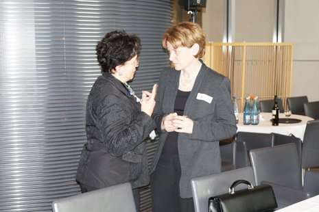Am Rande der im Mai 2013 stattgefundenen DTI-Tagung in Berlin und Podiumsdiskussion im Deutschen Bundestag, Ilse Schröder und Birgit Homburger, MdB, FDP. Frau Homburger ist Mitglied des Haushaltsausschusses.