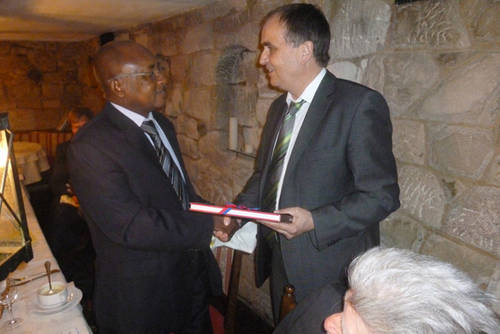 Bürgermeister Volker Grab überreicht Sudans Verkehrsminister Dr. Ahmed Babiker Nihar beim offiziellen Empfang im "Stiftskeller" einen Bildband der Stadt als Willkommenspräsent.