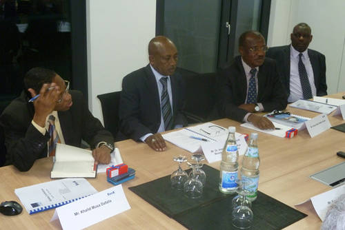 Abendliche Eisenbahnprojekt-Konferenz bei BVB UG Consult. Von links: Khalid Musa Dafalla, Vertreter der Botschaft des Sudans in Berlin, Dr. Ahmed Babiker Nihar, Minister of transport, road & bridge (Verkehrsminister) des Sudans, Ministerialberater Ishaq Adam Bashir Gama, Karameldin Abdalla, sudanesische Botschaft in Berlin